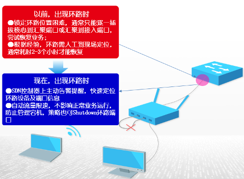 通过“协议探测+环路表征”快速实现环路定位,SDN控制器通过软件界面清晰明了地呈现出具体的环路位置,当确定问题发生在二层环路时,SDN控制器会通过告警、关闭端口、限速等方式快速阻断,避免造成业务中断。