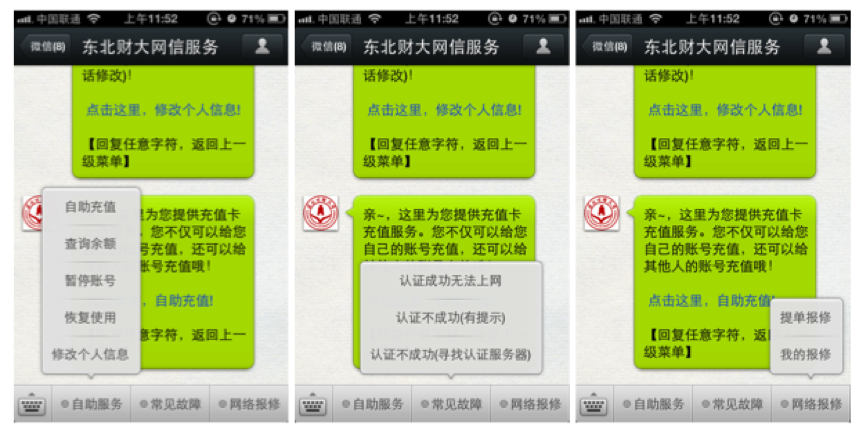 东北财经大学13年率先部署了SAM微信自助服务,13年秋季开学正式上线使用,由于微信平台在学生群体中使用已经很广泛,SAM的微信自助服务推广很快,开学前几天就有大量用户关注使用,一方面让校园网带给学生全新的体验,另一方面部分用户采用微信自助服务端办理业务,大大减轻了网络中心的工作量,提升了工作效率。