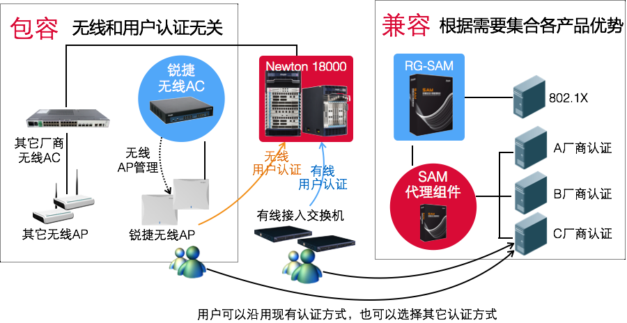 RG-SAM除了自身能提供802.1X认证方式,还可以通过代理组件帮助高校整合其它供应商的认证计费系统,让用户可以自由选择自己喜欢的认证方式。