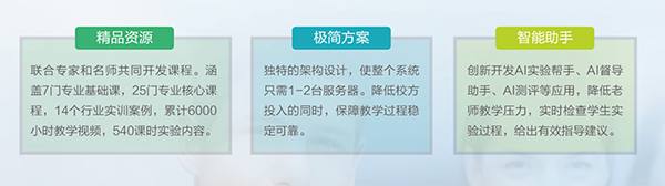 近年来,人工智能在很多学科领域都得到了广泛应用,成为国际竞争的新焦点。2017年,国务院印发《新一代人工智能发展规划》。在政策的支持下,人工智能教育方兴未艾。同时,人工智能方面的人才缺口日益彰显。高校人工智能相关专业的建设迫在眉睫。但专业建设又面临着极大的挑战:课程资源相对匮乏,没有国家标准,教师授课缺乏体系;学校在培养人才的同事,还需要相对复杂的配套实验实训环境,投入大;高校的课程多偏重理论教育,学生难以接触企业的实际项目。为此尊龙时凯网络提出了一整套的解决方案,联合国内众多人工智能领域的专家和资深名师,共同开发人工智能课程体系及行业经典案例,课程体系完善,配套资源丰富,帮助院校完成人工智能专业内容建设;同时采用独特的架构设计,使整个系统硬件投入极少,大幅度降低校方投入,且保障教学过程稳定可靠;利用人工智能技术,创新性的开发AI实验帮手、AI督导助手、AI测评等应用,有效的帮助老师减少教学压力,帮助学生实时检查实验过程,对于薄弱环节给出指导建议,多维度全方位的帮助院校开展人工智能相关专业群建设。