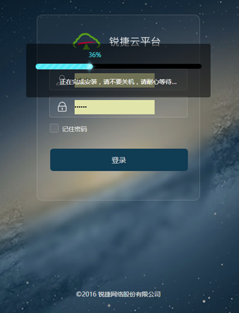 首次登陆RCP,会提示系统“正在完成安装,请不要关机,请耐心等待”。遇到该提示,请勿操作,等待安装完成。初始化完成后,便可以登录RCP系统,首次登陆的用户名是admin,密码是admin。