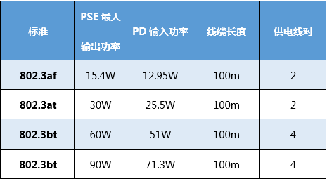注:802.3bt已被批准但暂未正式发布,也没有正式命名,当前常用HPoE、PoE++、PoH、UPoE等名称表示。