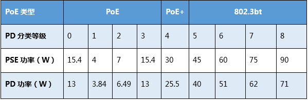 相比802.3at(PoE+)标准,802.3bt新增两种供电类型,对应60W、90W输出功率。PSE端能够输出的功率选择性更大,根据PD需要选择相应的PSE端的功率。