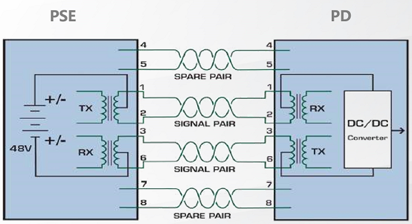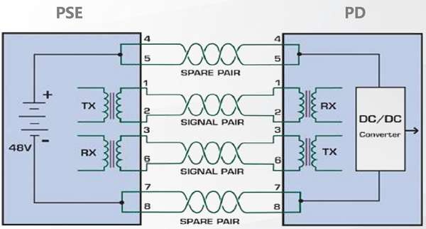 使用以太网电缆中没有被使用的空闲线对(4/5、7/8)来传输直流电。