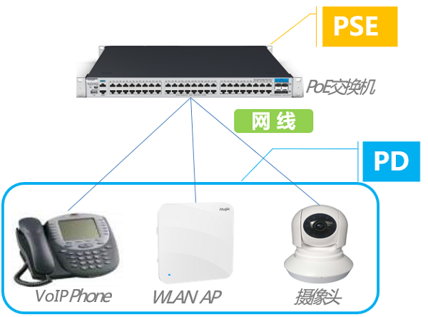 • 供电设备(PSE):Power Sourcing Equipment,给终端供电的设备;