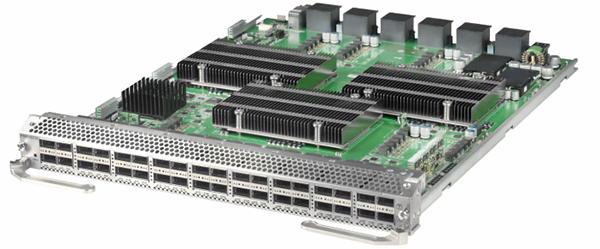 目前在传统的DCN架构,如图 1-1所示,在T3层次采用的就是Chassis交换机,一般采用16槽位,配置36口100G的板卡,整机可以提供576个100G接口,如下图: