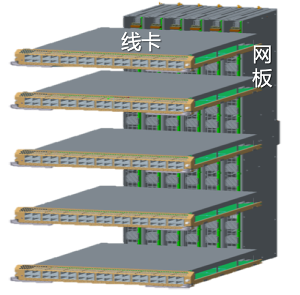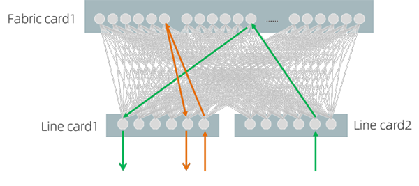 Chassis交换机采用的是多芯片的设计,在接口板卡和Fabric板卡上大多采用多个交换机芯片组合,实现更高性能和更高端口密度,如下图: