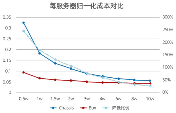 图 2-4是模拟计算在不同规模的服务器组网下,采用Chassis交换机(576个100G接口)和单芯片Box交换机(128个100G接口)的每服务器组网成本差异,这里包括交换机、线缆等组件,进行归一化的处理,方便直观看到差异。