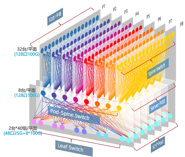 Sever-Pod由Leaf+Pod-Spine组成,对于25G网络来说,Leaf层产品端口形态一般是48x25G+8x100G,收敛比是1.5:1;Leaf设备上行通过8个100G接口连接到本Server-Pod内的8台Pod-Spine。