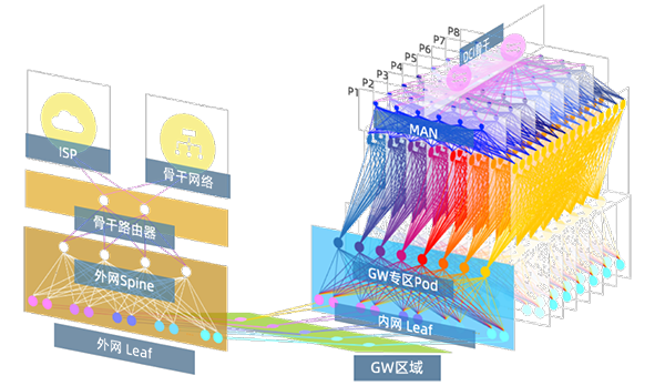 第二,建议以园区为单位建设一个集中、独立的GW(Gateway,网关)区域,例如Load-Balance、NAT(Network Address Translation,网络地址转换)、专线接入网关等,这种设计的考虑一方面在于GW业务对服务器的配置和性能要求与普通业务不同,而且两者对网络性能的要求也有较大差异,独立建设方便规划、运维,获得更好的收益。
