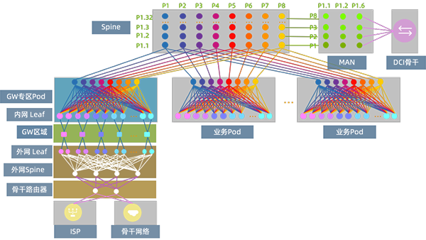 整个集群基于Leaf+Pod-Spine+Spine三级组成,其中Leaf+Pod-Spine组成Server-Pod,每个Server-Pod支持标准数量的服务器规模,作为标准化模块,整网通过横向扩容Server-Pod实现单集群服务器规模的平滑扩容,就像堆积木一样。