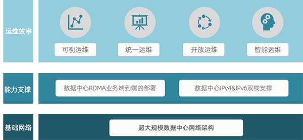 如上图所示,除了架设一张高性价比的超大规模数据中心基础网络,在面向业务层面的能力,包括提供RDMA业务端到端的部署,提供数据中心IPv4&IPv6业务双栈;在此基础上,基于全新一代的交换机芯片技术架构,提供统一、标准的运维能力,包括可视运维、统一运维、开放运维、智能运维。