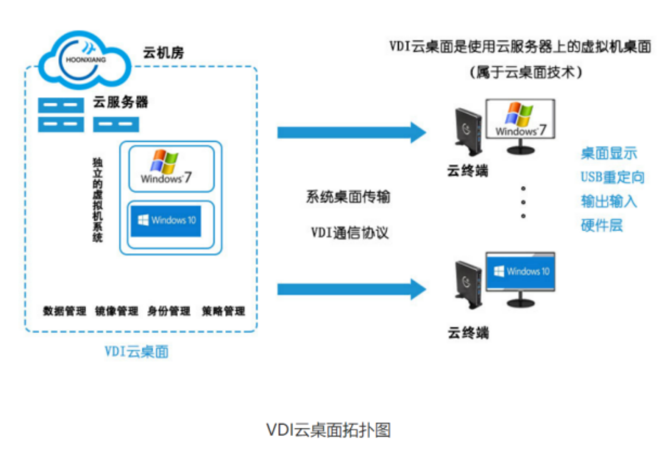 VDI (Virtual Desktop Infrastructure虚拟桌面基础架构)。VDI为集中存储、集中运算的虚拟桌面基础架构,属于云桌面技术。该架构是把所有的用户桌面的数据运算都集中在服务器端,用户桌面接收的只是操作系统环境。