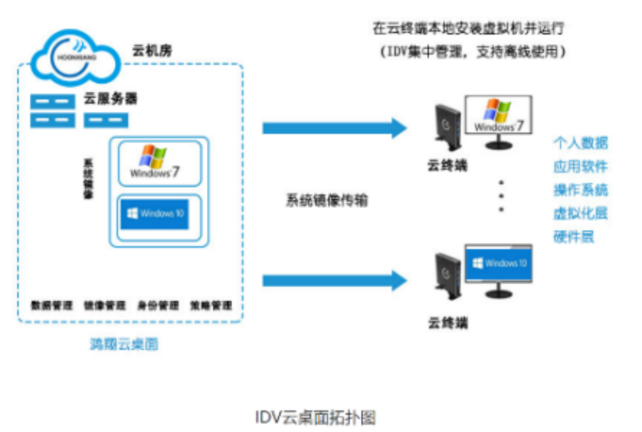IDV采用的是终端虚拟化技术,数据存放终端,不受网络影响,断网亦可访问。